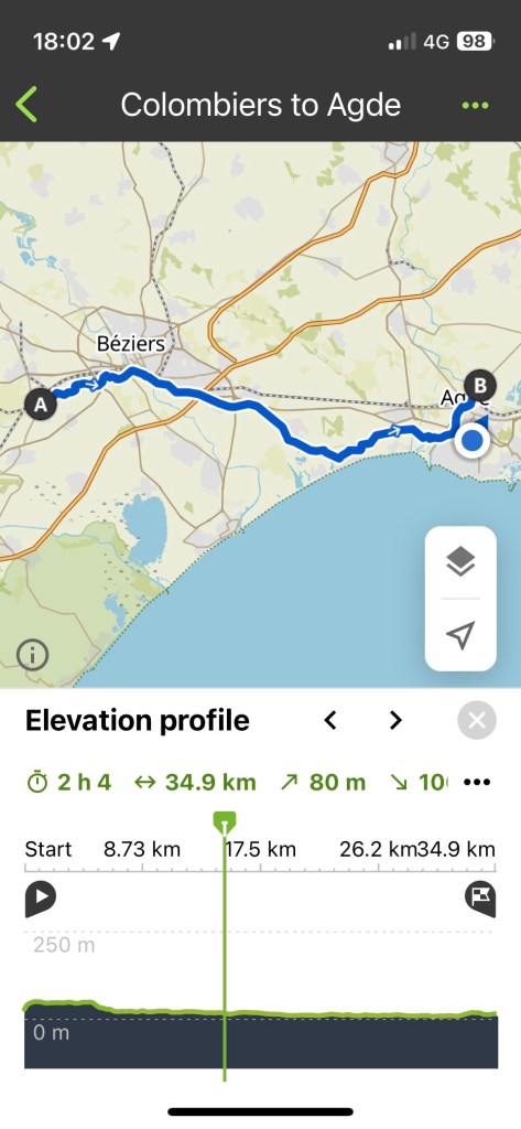 We returned to the van and Janice got the coordinates for our chosen site and I set off cycling to our destination near Adge on the river Herault and virtually on the Mediterranean.