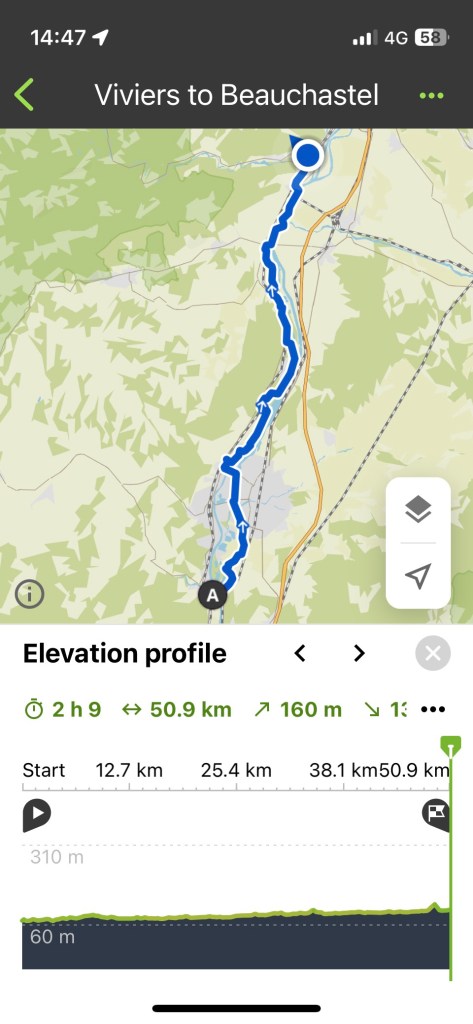 No pain aux raisins were left at the boulangerie this morning….what a tragedy, I got a pain aux chocolate instead and put it in my cycle bag for later in the day. We drove back to Viviers to set me off on the Rhône again.