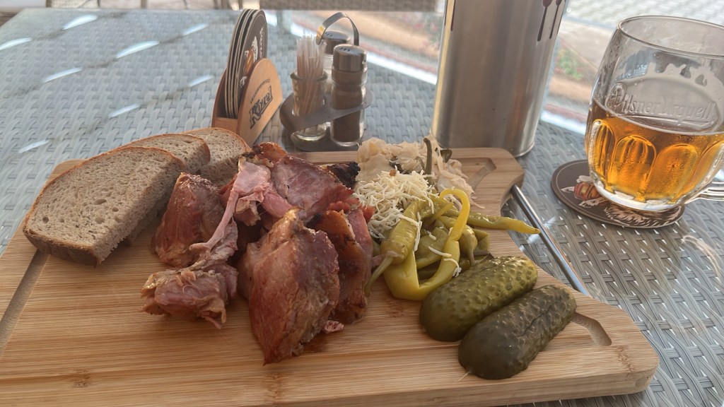 I sat outside under a shade that included a light mist of cool water spray, very pleasant. The food was great too. I had a pork knuckle off the bone.