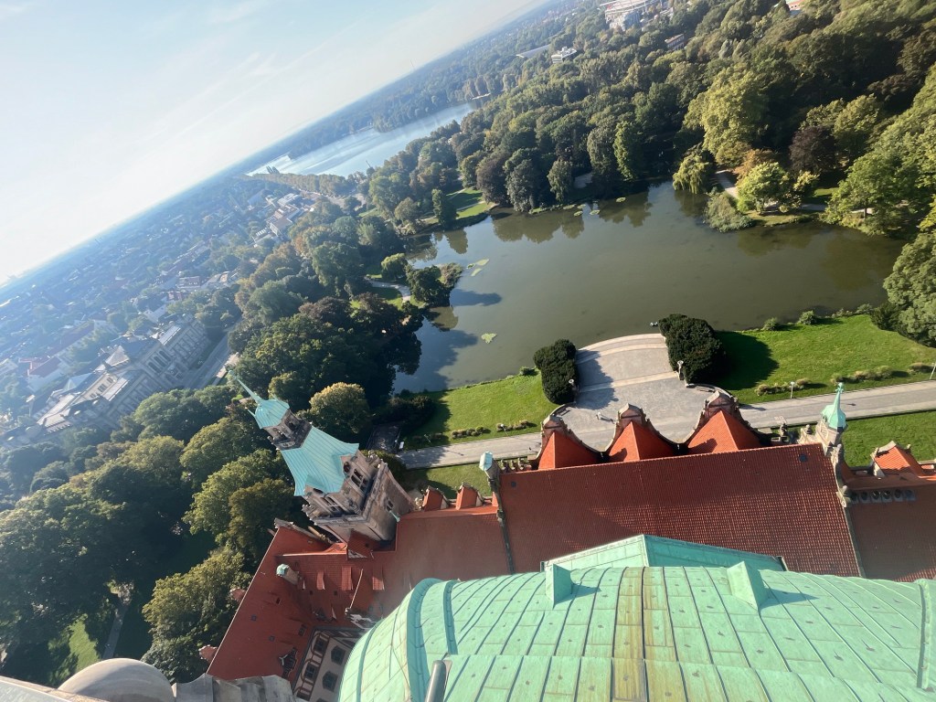 My first target was to enter the Neue Rathaus and get to the top for the views at 10am when it opened. My slowing down isn’t doing too well so far when I am aiming to get so,where for opening time. One interesting thing is that the lift that takes me to the viewing area on the dome is unique. It is the only lift in the world that operates at a 17 degree angle from perpendicular. You have to lean whilst it goes up and down.