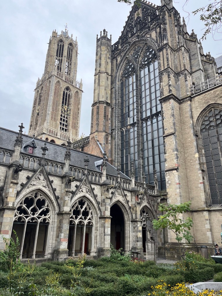 The morning was cool and bright. My route was short but pleasant….cycling through a forest on a good track. I was in Utrecht by 10.30am. It’s a city I have briefly visited before with Janice on our Rhine cycle trip in 2019. I remember that it was a pretty canal city but the skyline dominant feature (its tall Dom Tower, known as the Domtoren, was covered in scaffolding.